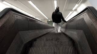 ‘Ik moet er uit’, zegt hij. Hij staat op. Hij verlaat de metro. Als de metro hem passeert zwaait hij nog even naar me. Ik glimlach.